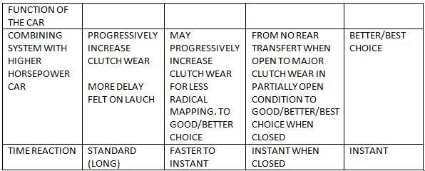 Here is a table to help you compare the various traction enhancer systems in different conditions. The numbers have been not measured on bench but are given on a matter of comparison to show the impact of the pressure applied on the clutch pack in a given condition. Except when the previous state is written as stopped, we consider the Haldex unit was solicited just before the measurement to the exposed condition.